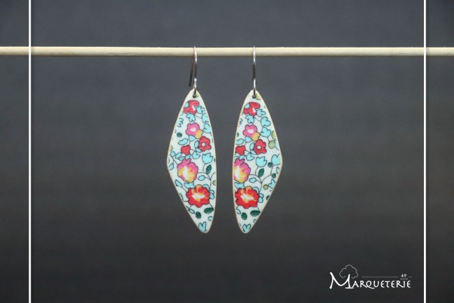 Ces boucles d'oreille en bois de forme éventail sont réalisées en collant un tissu liberty anglais Tana Lawn sur le support en bois, une breloque métal argenté en forme de losange rallonge la boucle d'oreille par le bas.