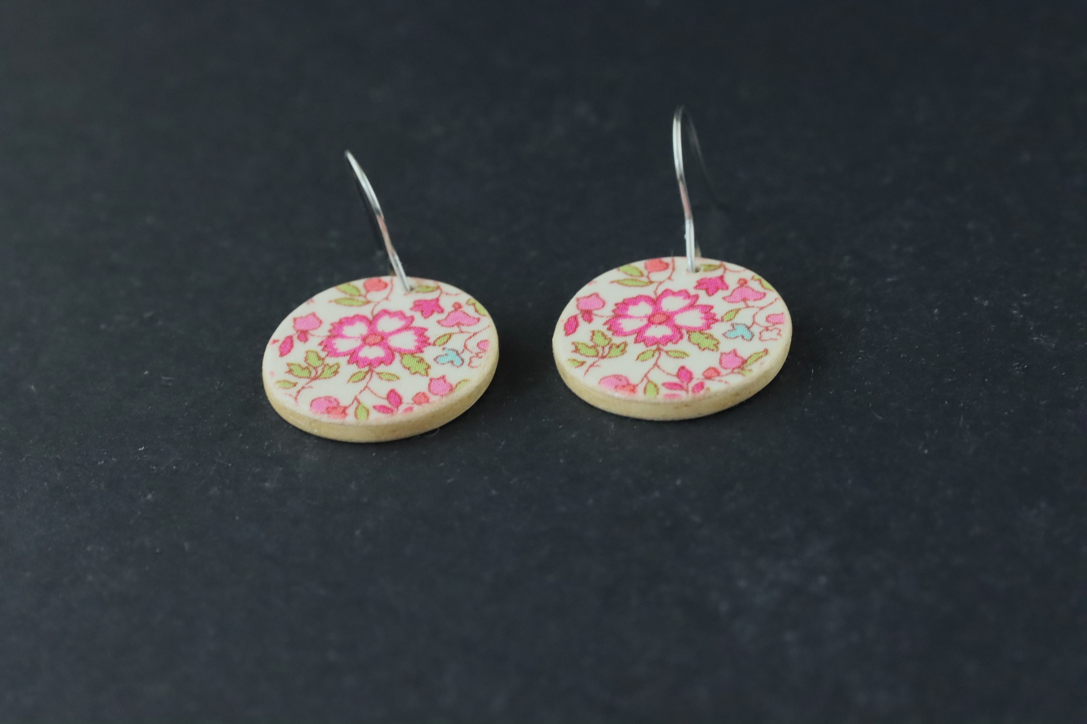 Paire de boucles d'oreilles rondes en bois et tissu liberty anglais Katie et Millie rose