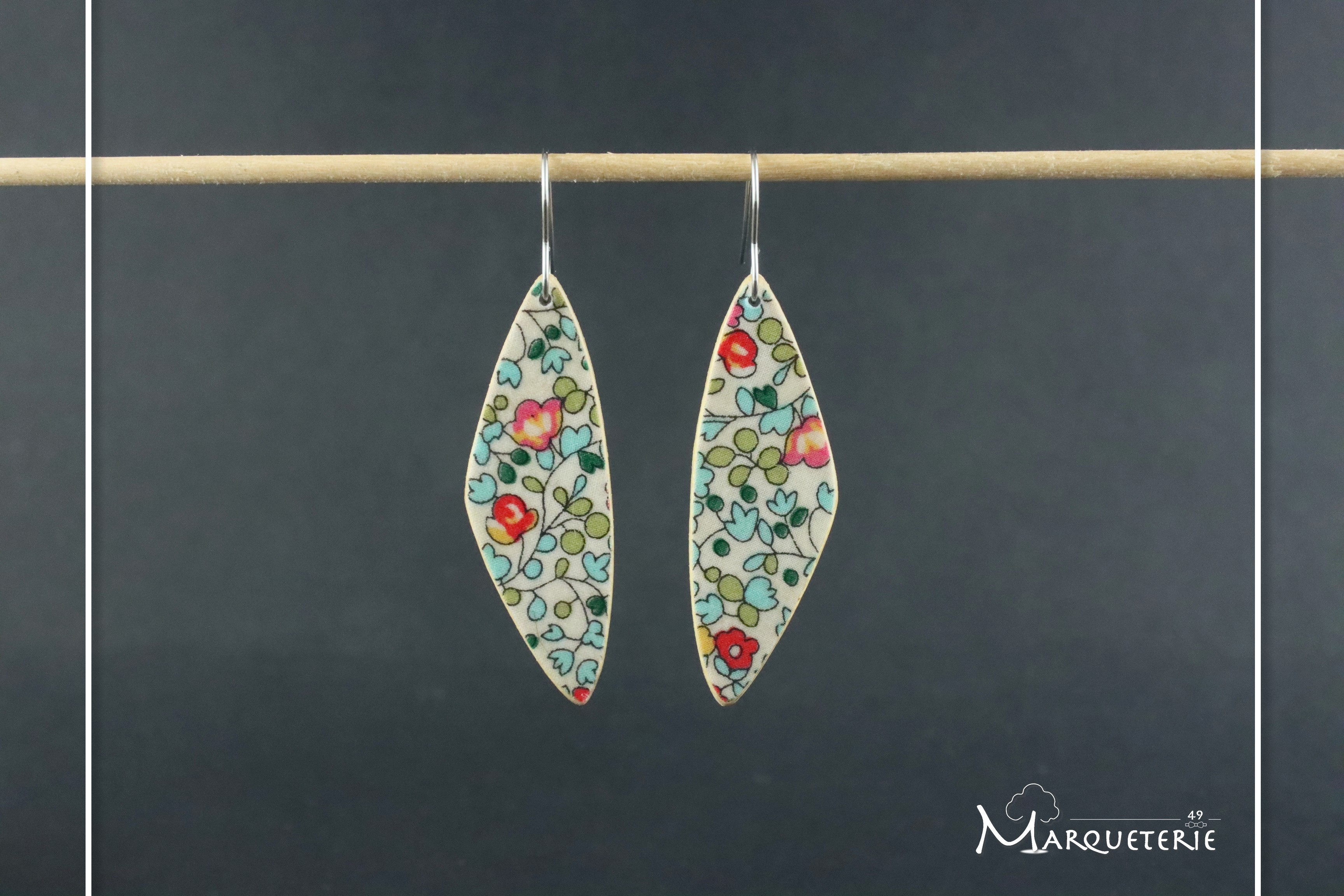 Paire de boucles d'oreilles en bois et tissu liberty fleurs très coloré, pétillant, de forme allongée