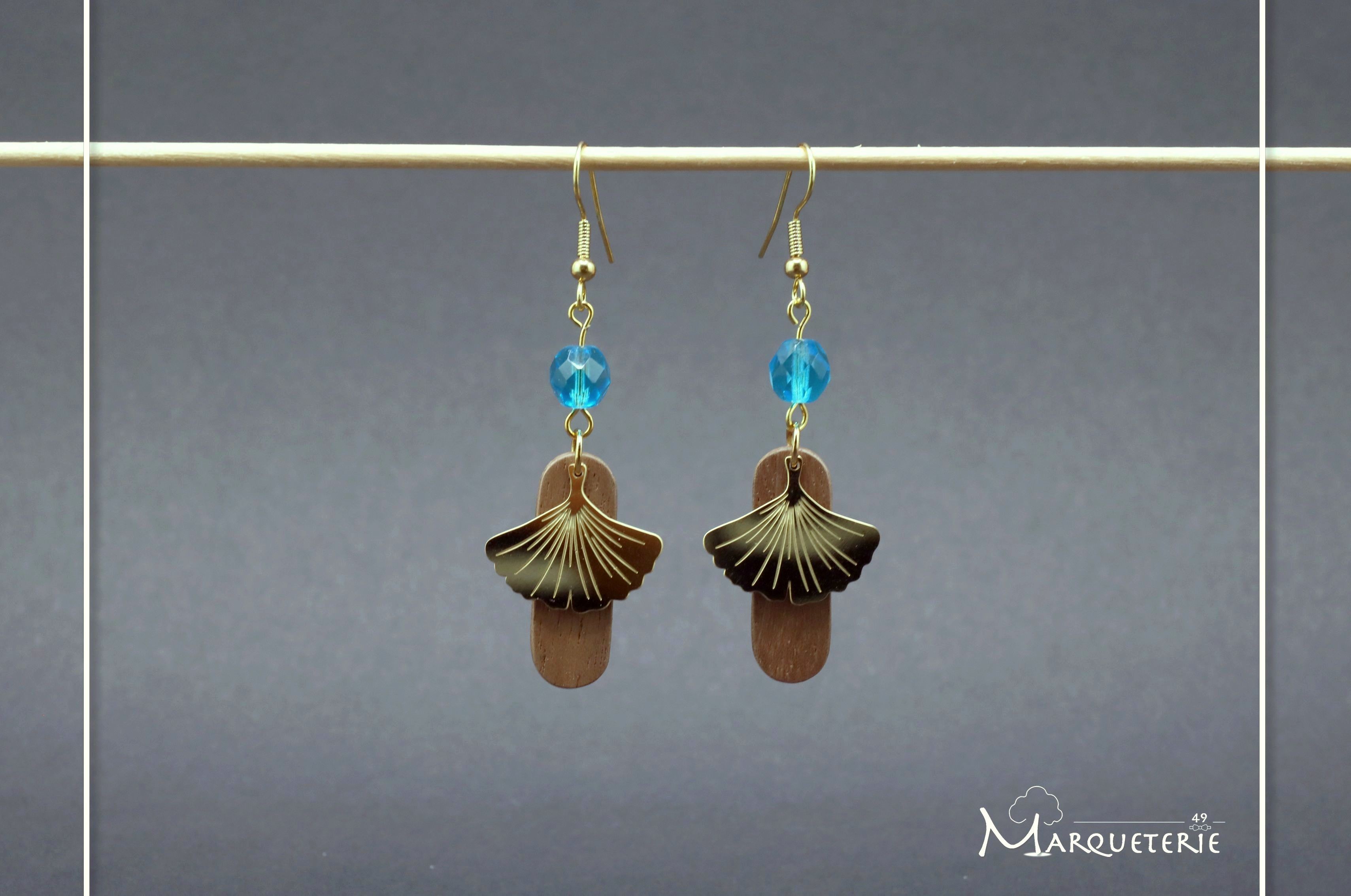 Paire de boucles d'oreille fines et allongées, formées d'un bâtonnet en bois de noyer surmonté d'une perle à facette de couleur bleue agrémentées d'une feuille de gingko dorée