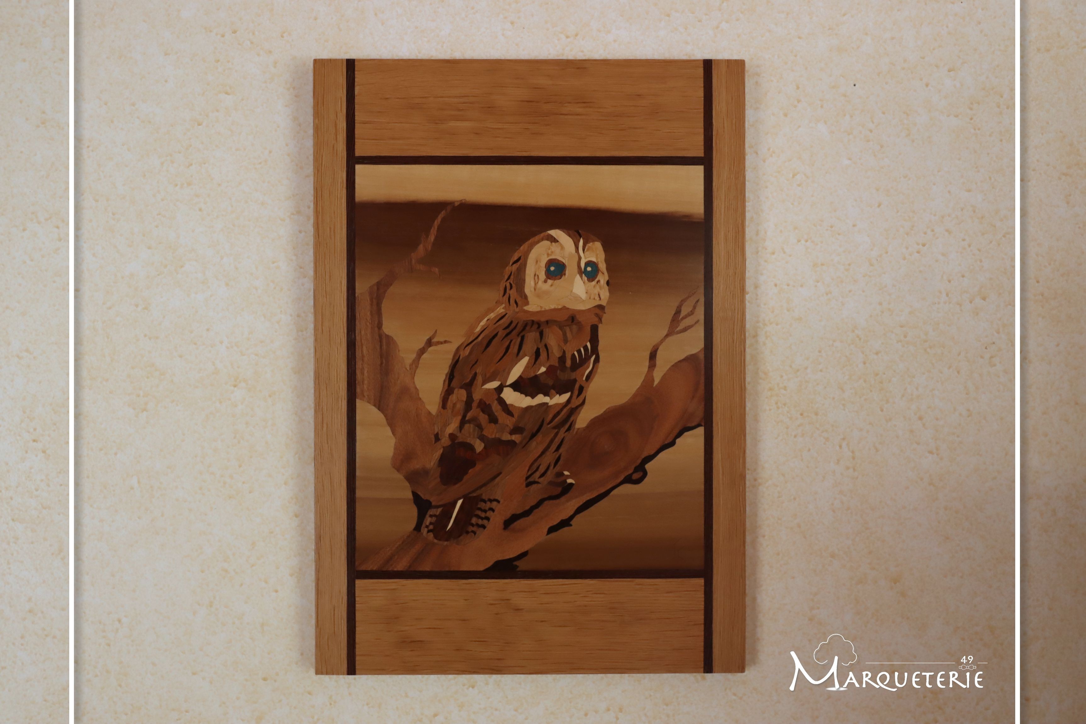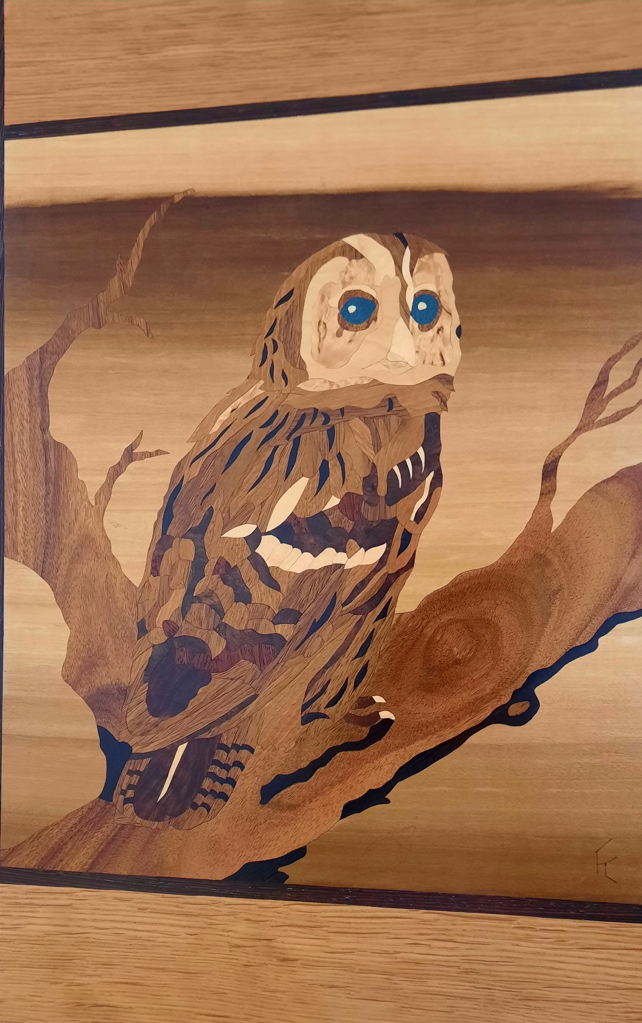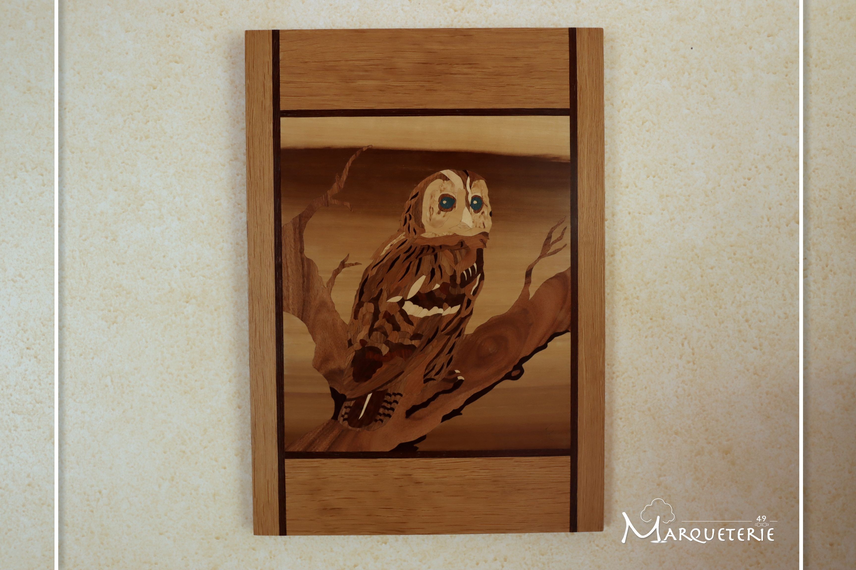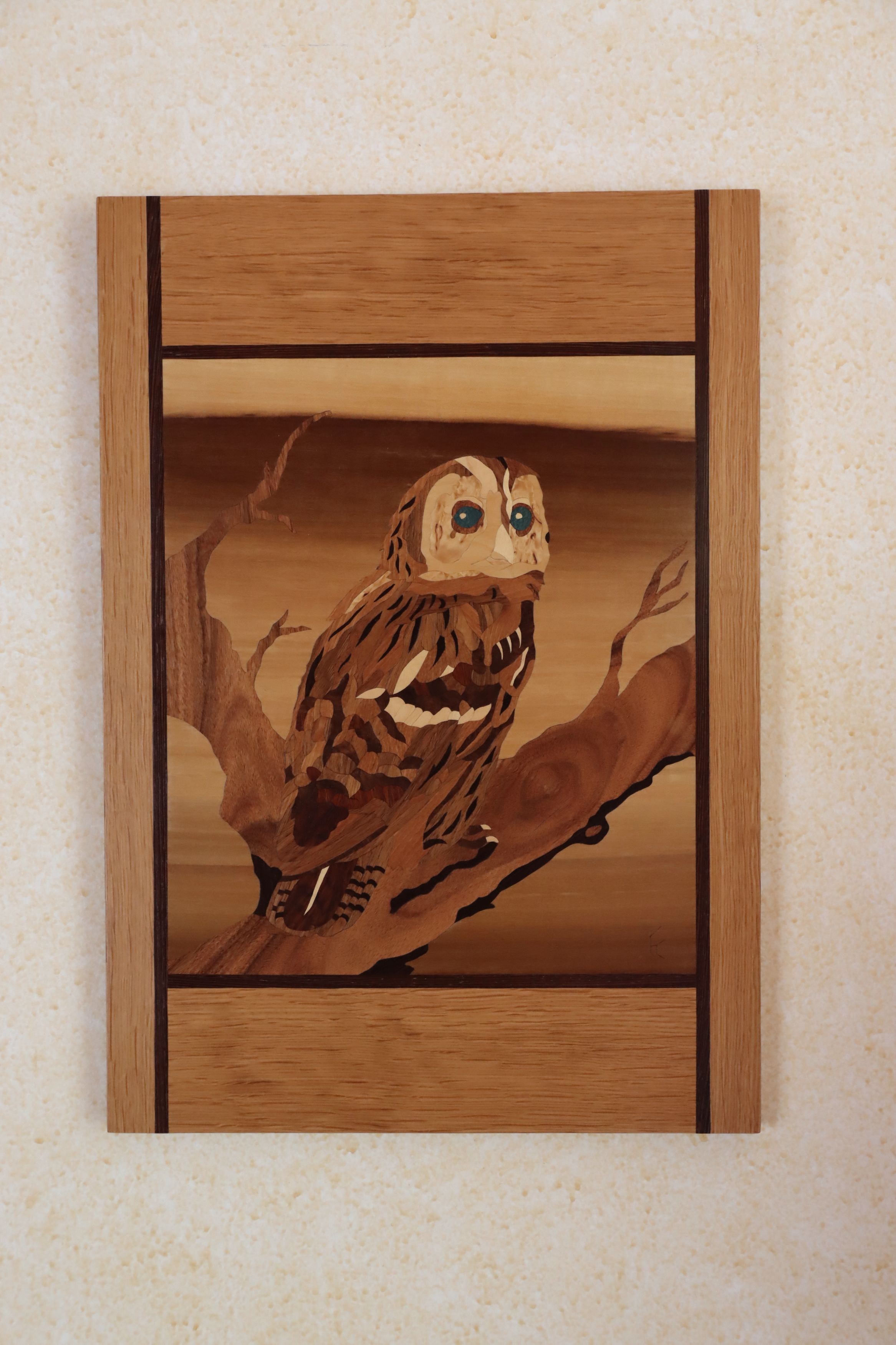 Tableau réprésentant une chouette ou un hibou, réalisé en marqueterie bois (environ 50 heures de travail pour l'ensemble du tableau !)