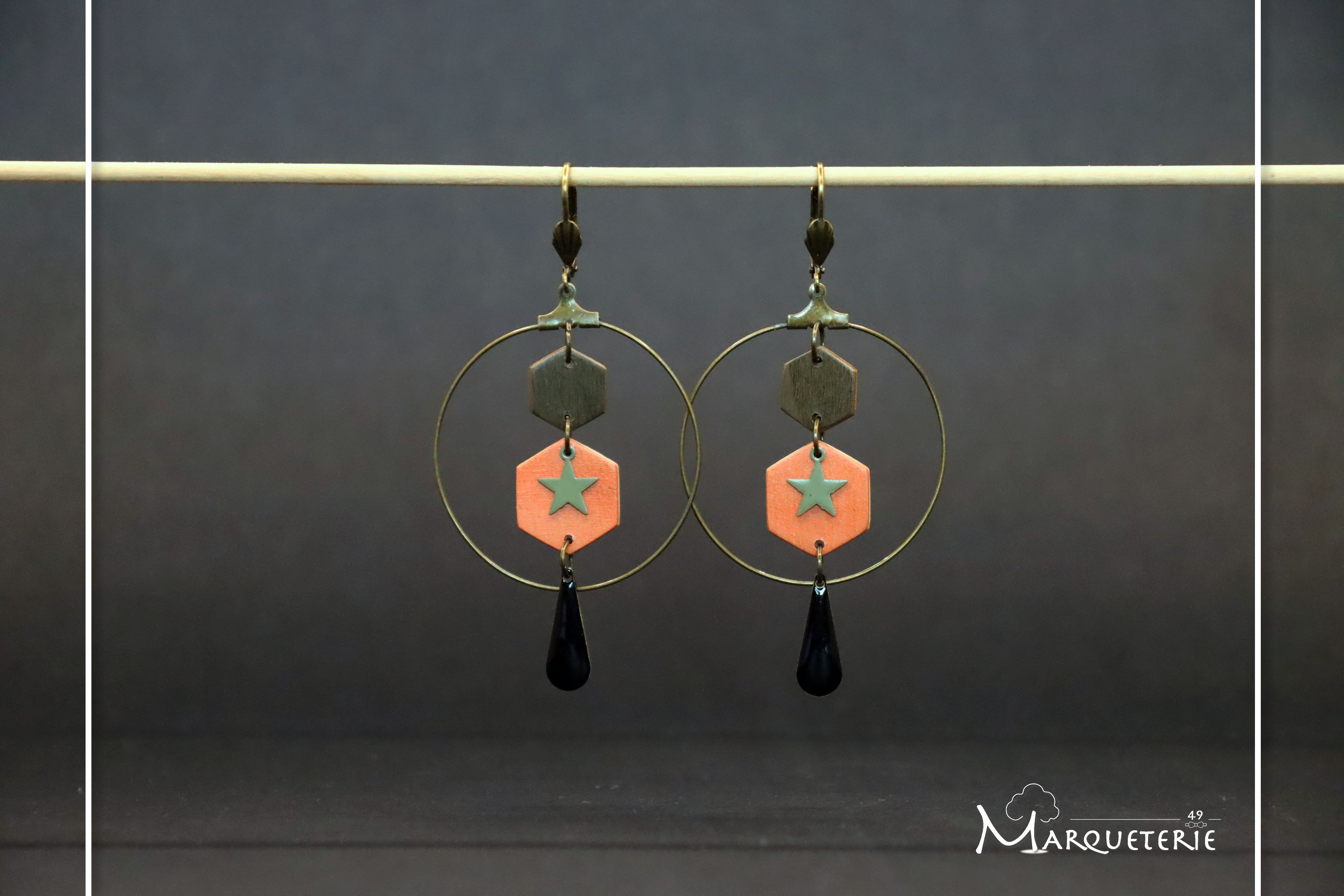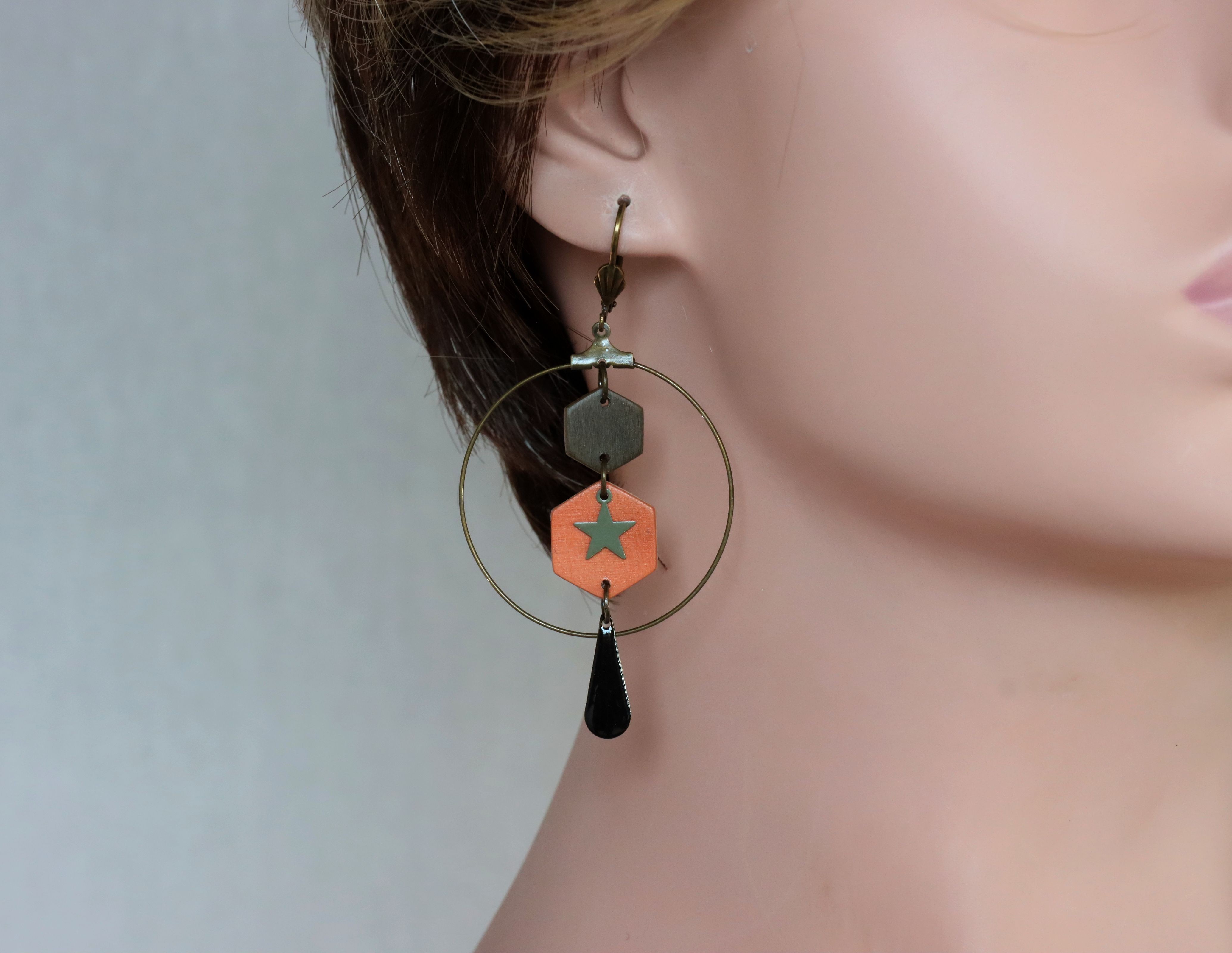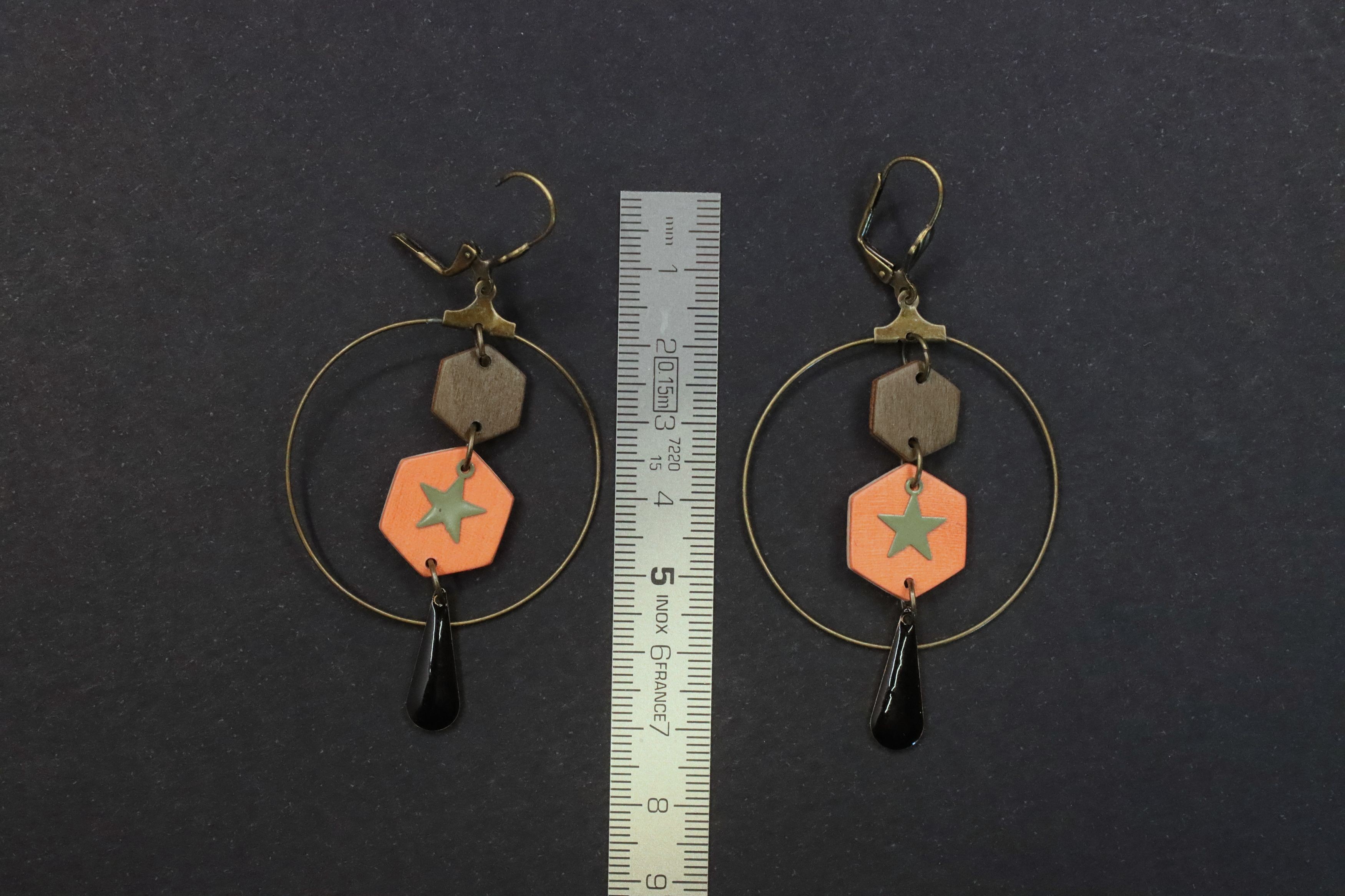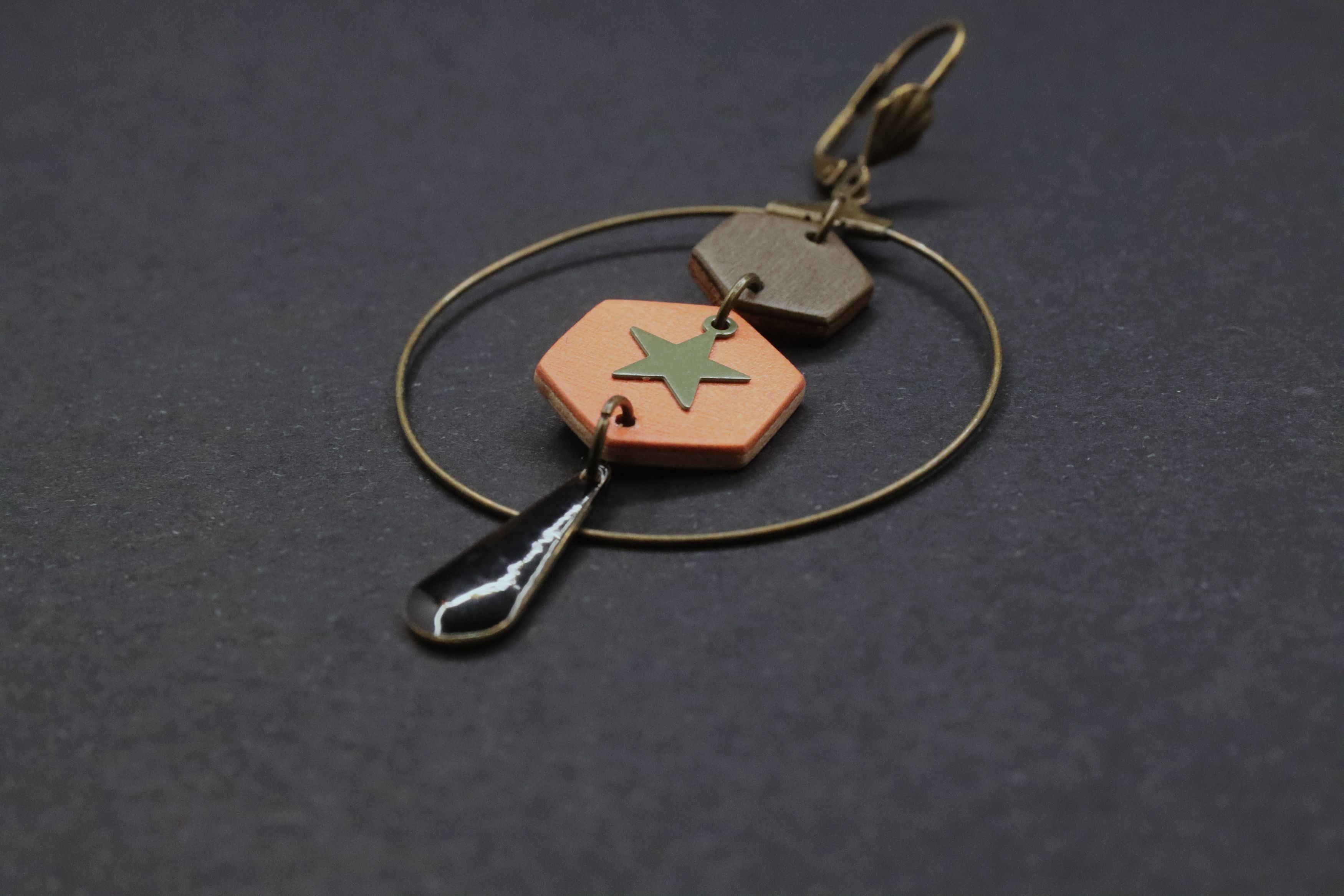 Ces boucles d'oreille sont composées de deux hexagones en bois insérés dans une créole de 4 cm de diamètre, agrémentés d'une breloque étoile en métal kaki attachée sur le grand hexagone en bois orange, et une seconde breloque noire de forme feuille/oblongue pendante sous la créole