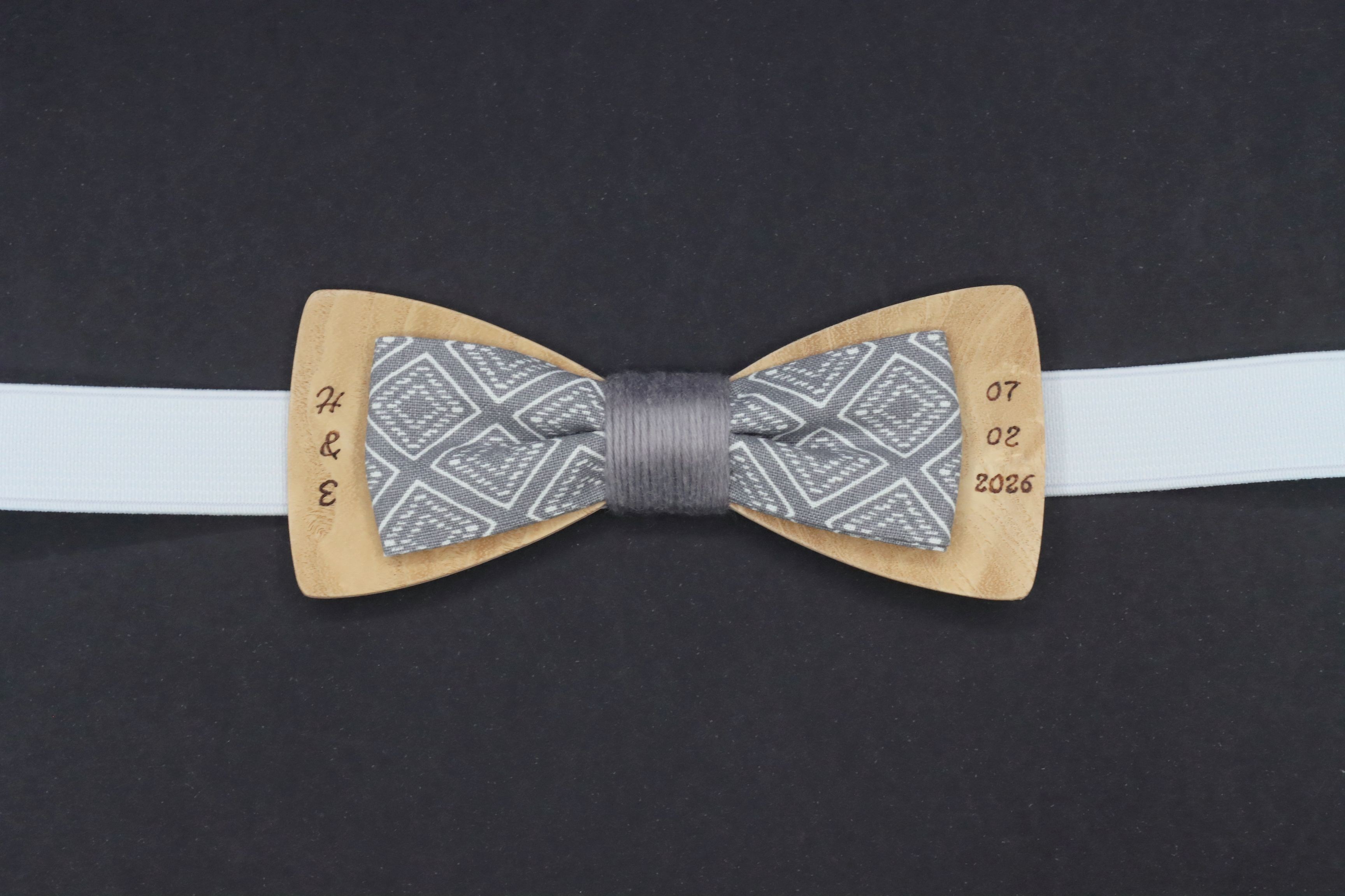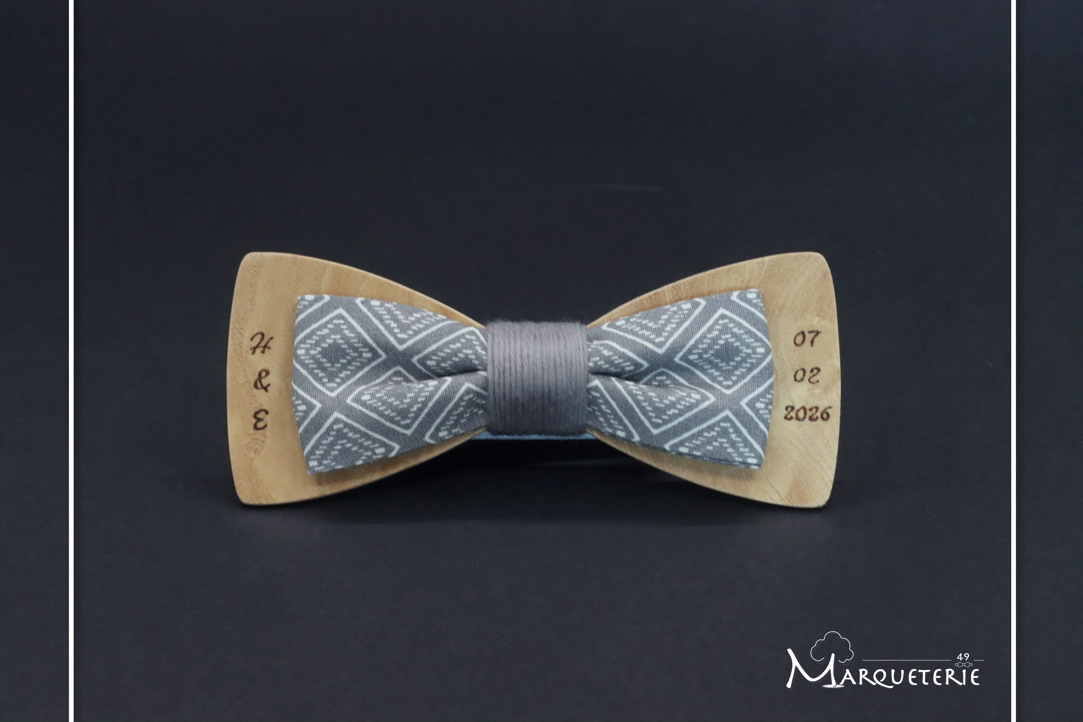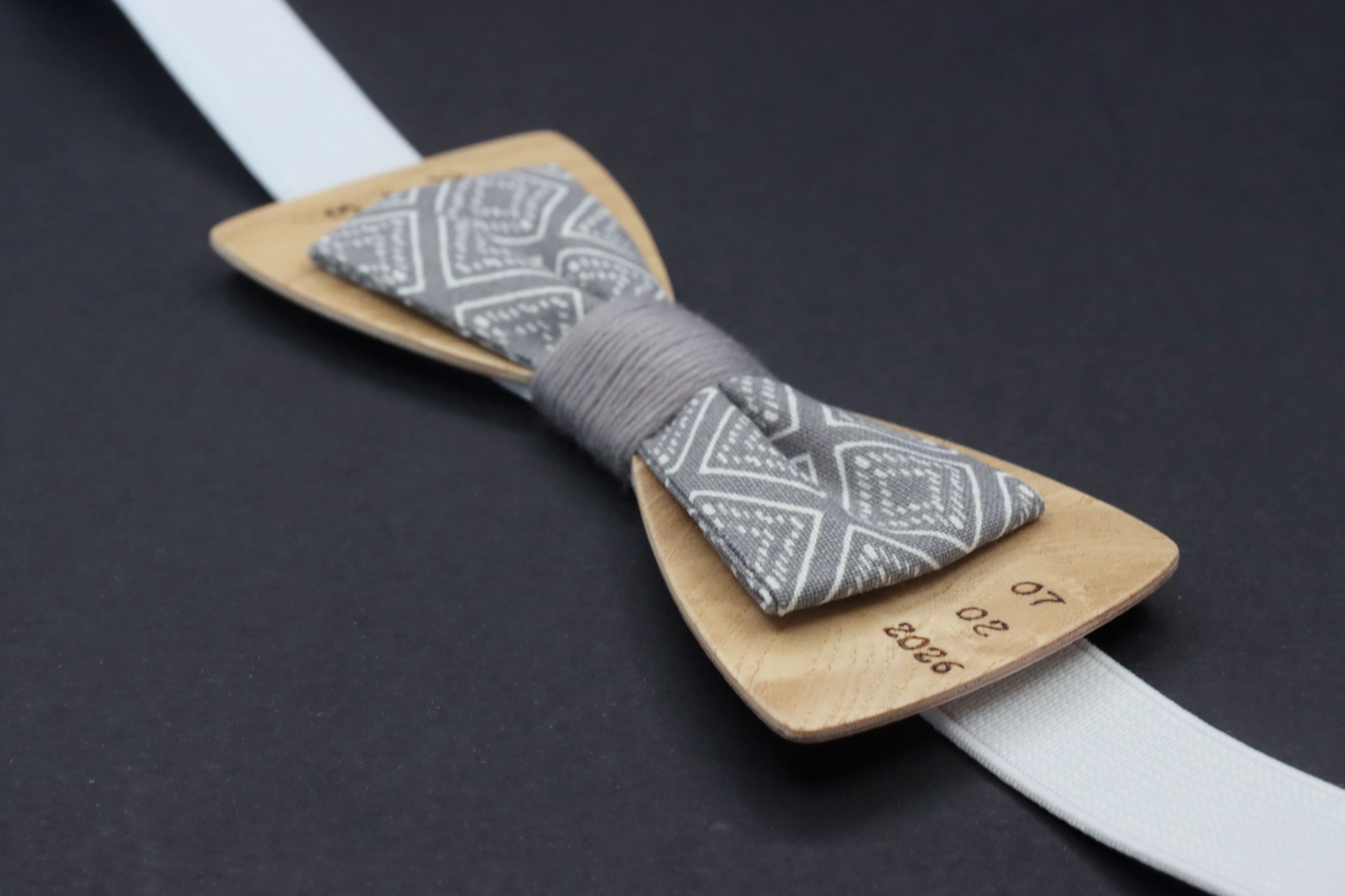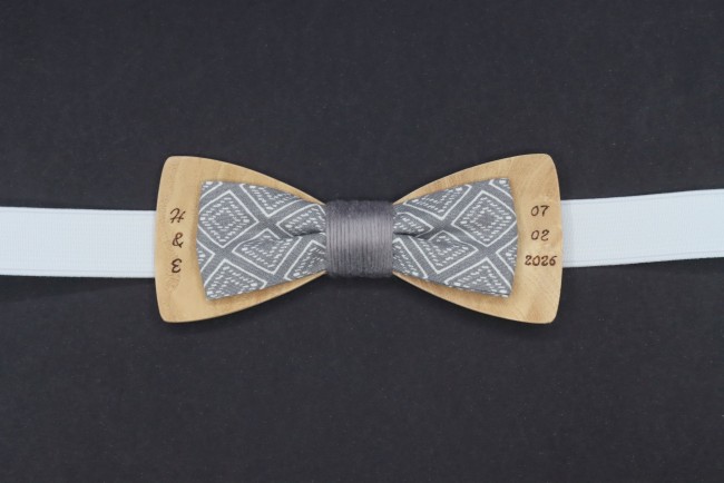Noeud papillon en bois clair (loupe de frêne), sur lequel est attaché un noeud papillon plus petit en tissu gris clair avec des motifs carrés blancs