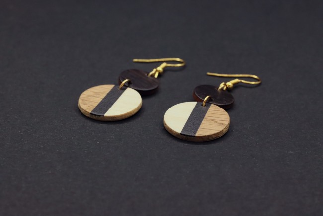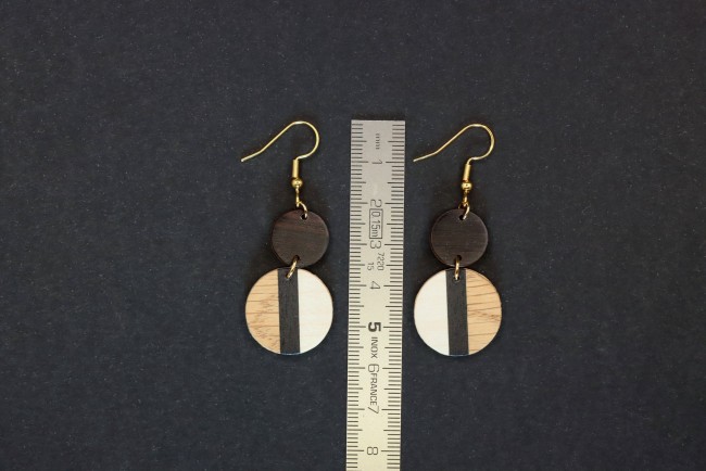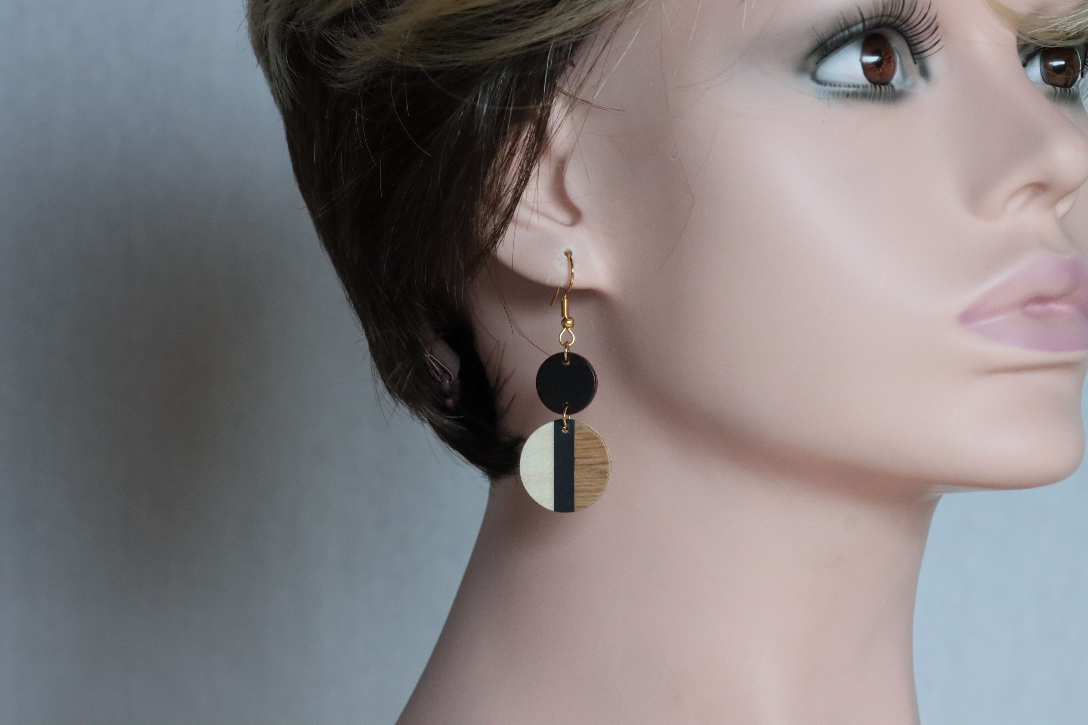 Ces boucles d'oreille rondes en bois sont sobres, elles sont composées chacune d'un petit rond en bois noir (ébène) associé à un plus grand rond en marqueterie bois (la marqueterie permet d'associer les 3 bois entre eux, avec au centre du placage d'ébène, et sur les côtés du chêne et du sycomore)
