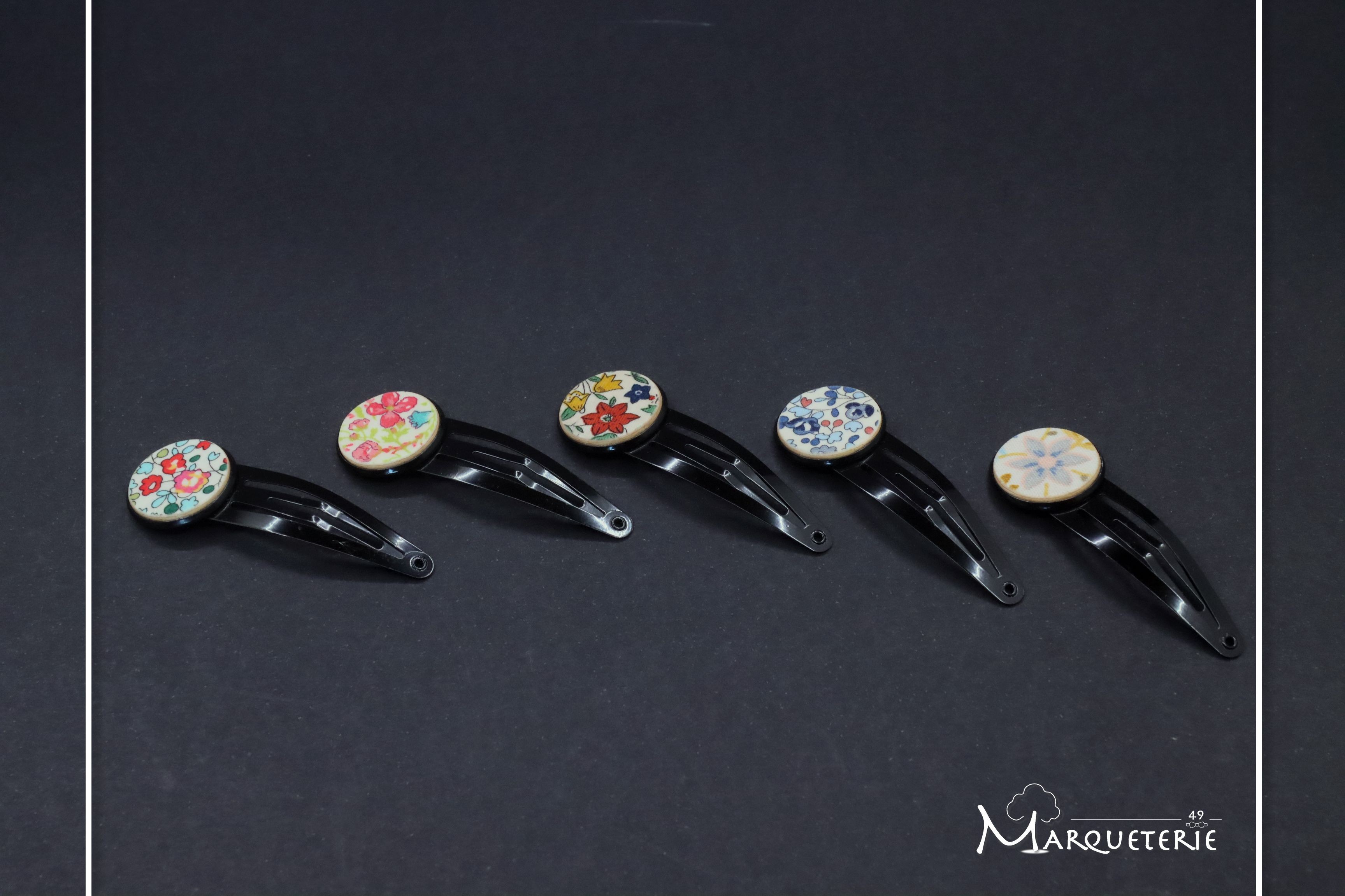 Ces barrettes cabochon sont uniques, un tissu liberty est collé sur un support bois puis verni, et ensuite collé sur le support cabochon de la barrette
