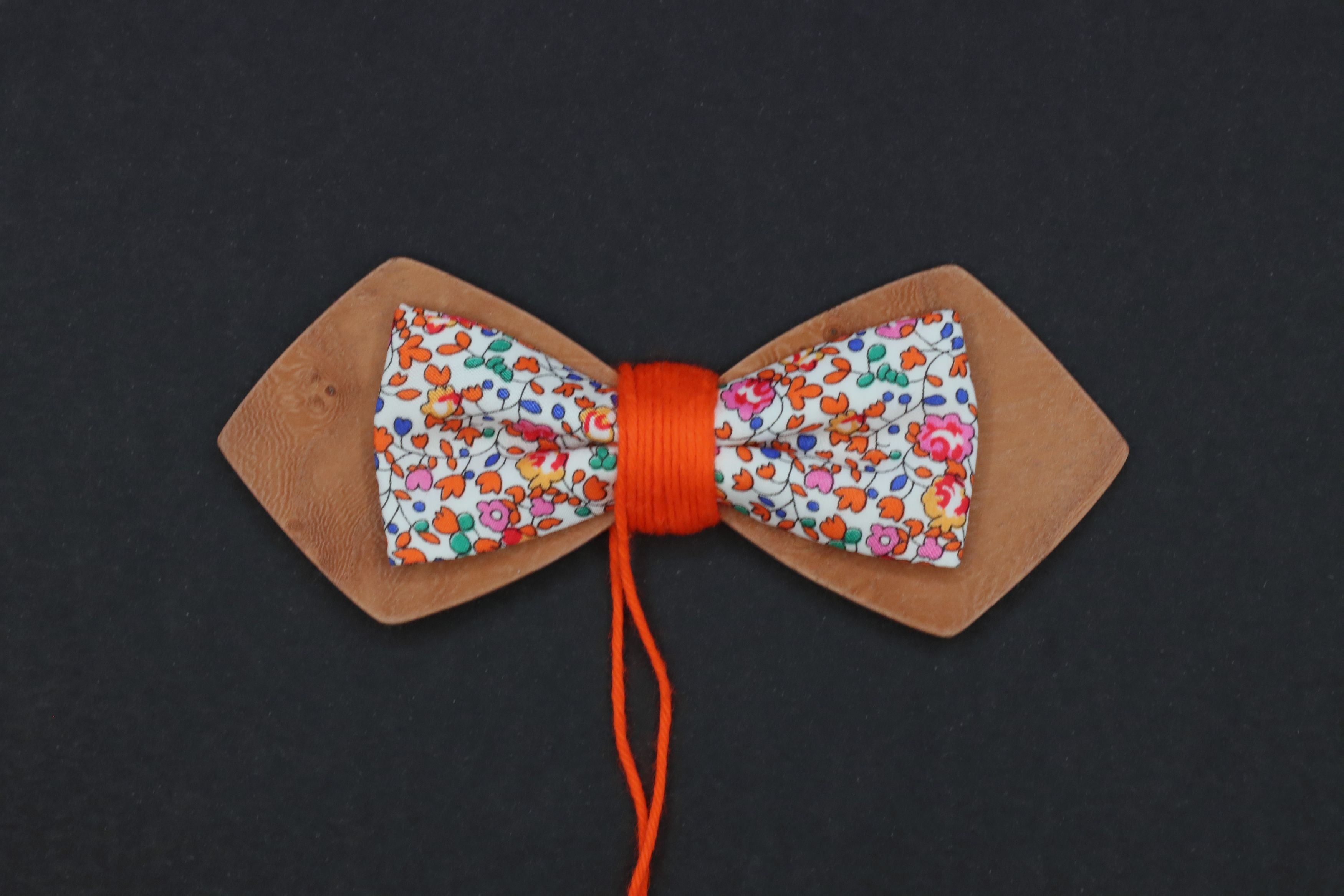 Noeud papillon double en bois (loupe d'orme) et tissu Liberty Tana Lawn Liberty Eloise orange, avec une pyrogravure au dos du noeud papillon (initiales des mariés et date du mariage) selon le modèle joint