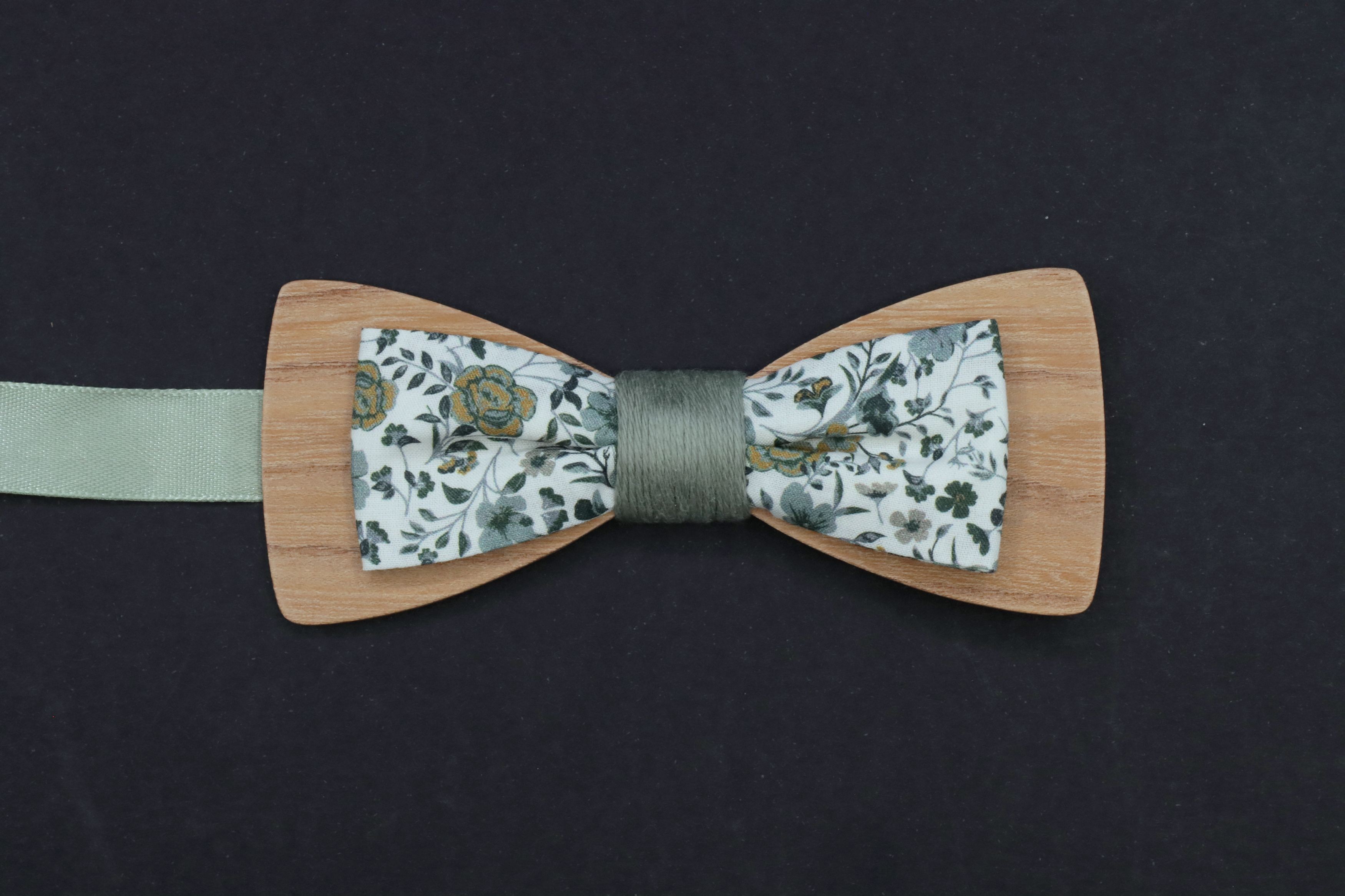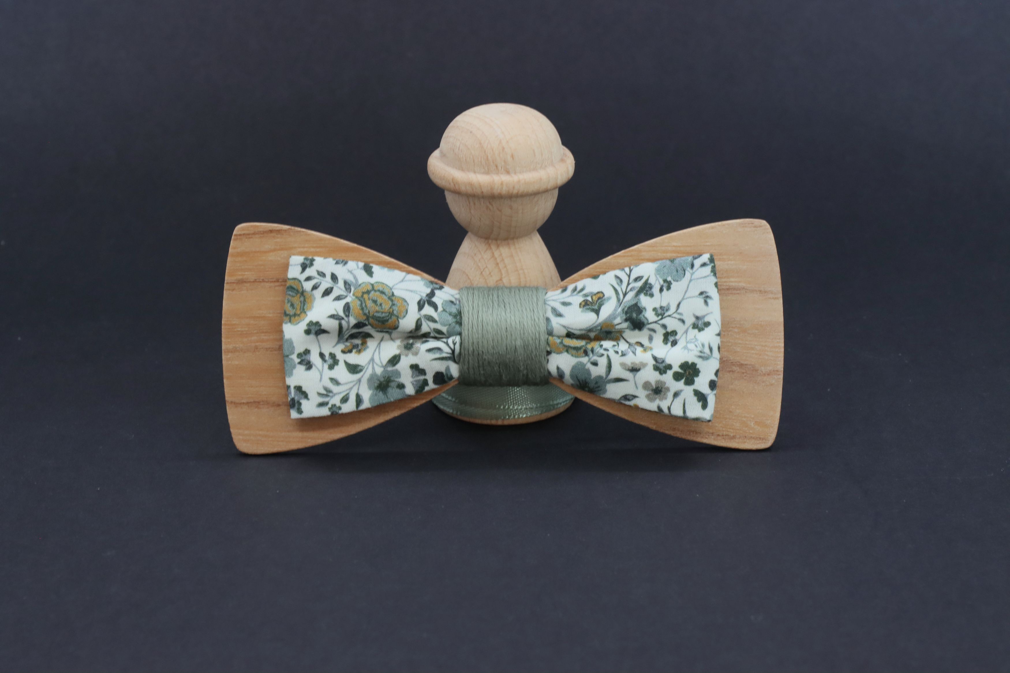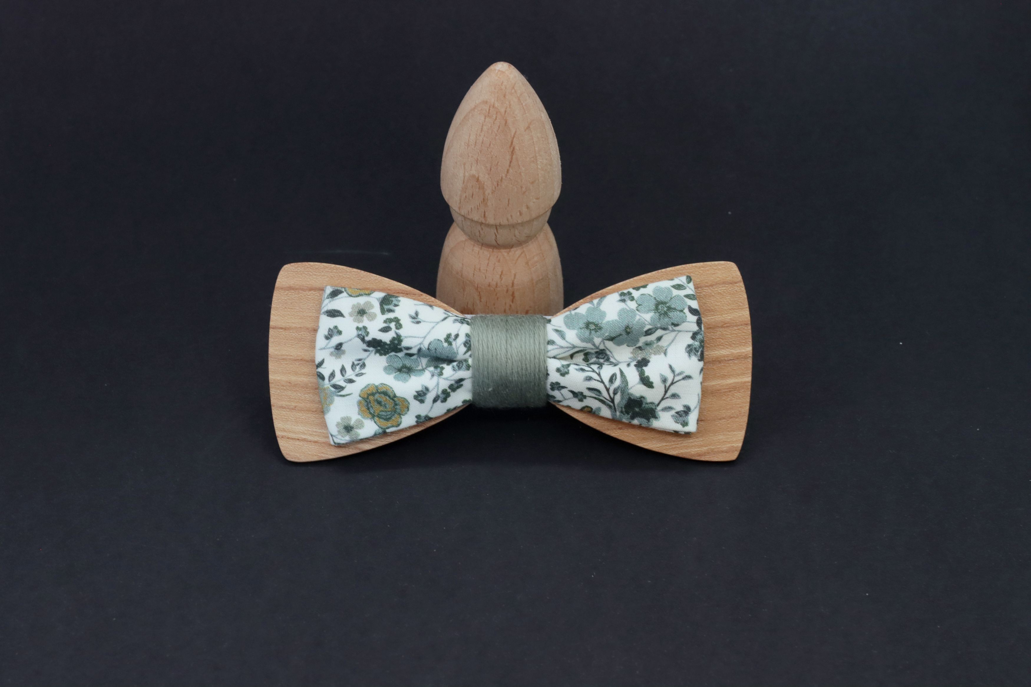 Association unique d'un noeud papillon bois (orme bois de fil) et d'un plus petit noeud papillon en tissu popeline liberty vert sauge eucalyptus !