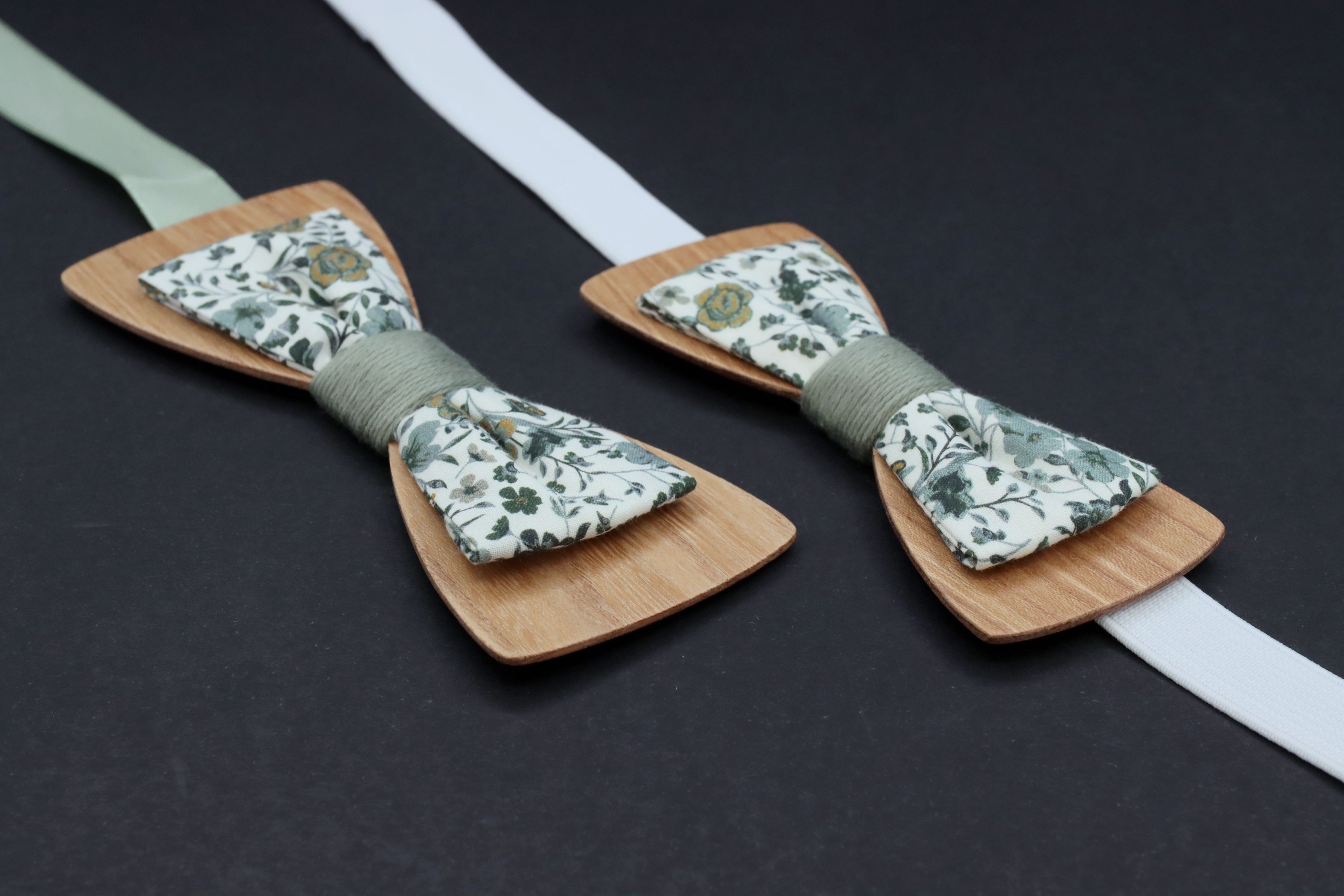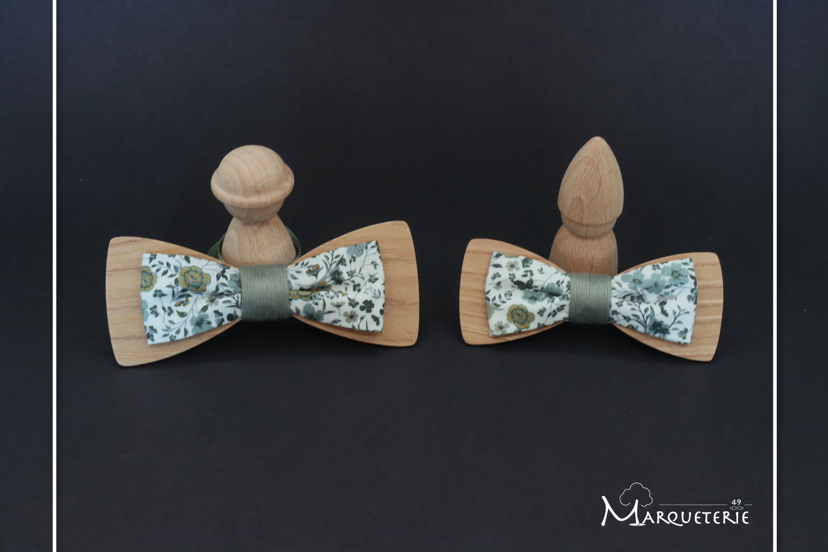 Lot de deux noeuds pap double bois tissu liberty homme et junior ado, pour que votre fils et votre conjoint soient assortis !