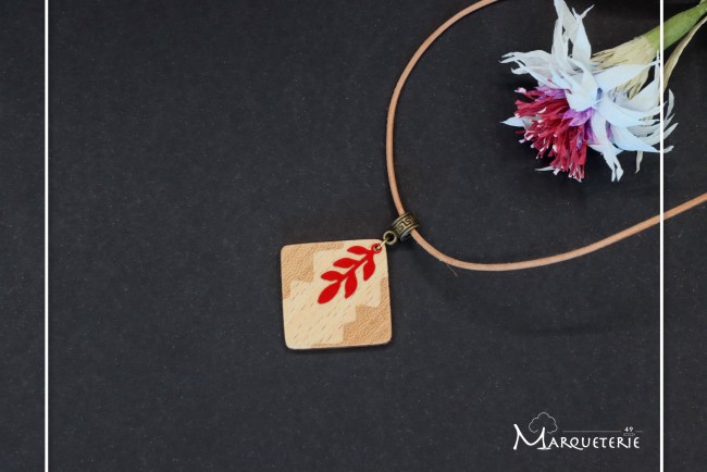 Collier réalisé en bois, deux formes géométriques différentes sont collées l'une sur l'autre